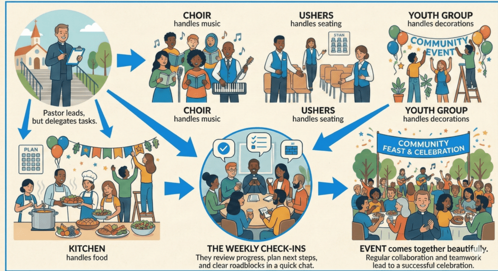 Think of a church preparing for a big community event. The pastor can’t do everything. So the choir handles music. The ushers handle seating. The kitchen team handles food. The youth group handles decorations. Every Sunday before the event, they gather for a quick chat. They check what’s done, what’s next, and what’s blocking progress. No long speeches. No drama. Just teamwork. Each group knows its role. They work in short bursts. They review progress often. And the event comes together beautifully.