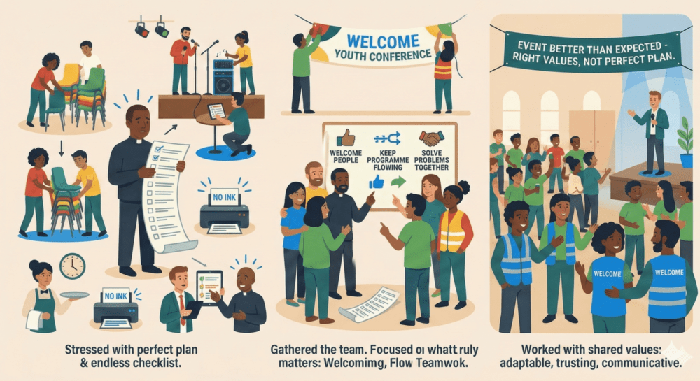 Imagine a pastor organising a big youth conference at a church in South London. Volunteers are everywhere. One group is sorting chairs. Another is testing microphones. Someone is decorating the hall. At first, the pastor tries to control everything with a long checklist. But things keep changing. The caterer is late. The printer runs out of ink. A guest speaker wants to switch time slots. So the pastor gathers the team. They agree to focus on what truly matters: welcoming people, keeping the programme flowing, and solving problems together. They stop bothering about the perfect plan. They talk more. They adjust quickly. They trust each other. The event turns out better than expected — not because everything went perfectly, but because the team worked with the right values.