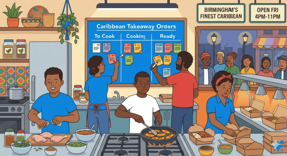Imagine a busy Caribbean takeaway shop in Birmingham on a Friday evening. Orders are flying in. One person is seasoning chicken. Another is frying plantain. Someone else is packing boxes. The owner has a whiteboard on the wall with three columns: “To Cook”, “Cooking”, and “Ready”. Every new order goes into “To Cook”. When someone starts working on it, they move it to “Cooking”. When it’s done, it moves to “Ready”. No shouting. No confusion. Everyone can see what’s happening. The board keeps the kitchen calm, even when the queue is long.