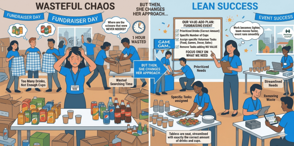 Imagine a mother organising a school fundraising day in Hackney. She has volunteers helping with food, games, decorations, and ticket sales. At first, everyone brings everything they think is needed. Too many drinks. Not enough cups. Three people buy the same tablecloths. One person spends an hour searching for scissors that were never needed. Half the effort is wasted. The day feels stressful. So she changes her approach. She asks, “What do we actually need?” She removes tasks that add no value. She keeps only what helps the event succeed. Suddenly, the work becomes lighter. The team moves faster. The event runs smoothly.