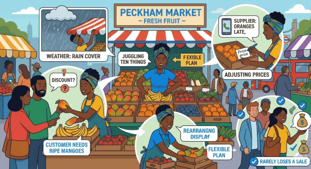 Picture a Saturday morning in Peckham Market. A fruit seller is juggling ten things at once. A customer wants ripe mangoes. Another wants a discount on bananas. Rain starts falling, so she quickly pulls a cover over the stall. Her supplier calls to say the oranges will arrive late. She adjusts her prices. She rearranges the display. She smiles at customers while constantly adapting. She doesn’t follow a long, fixed plan. She responds to what’s happening right now. And because she adapts quickly, she rarely loses a sale.